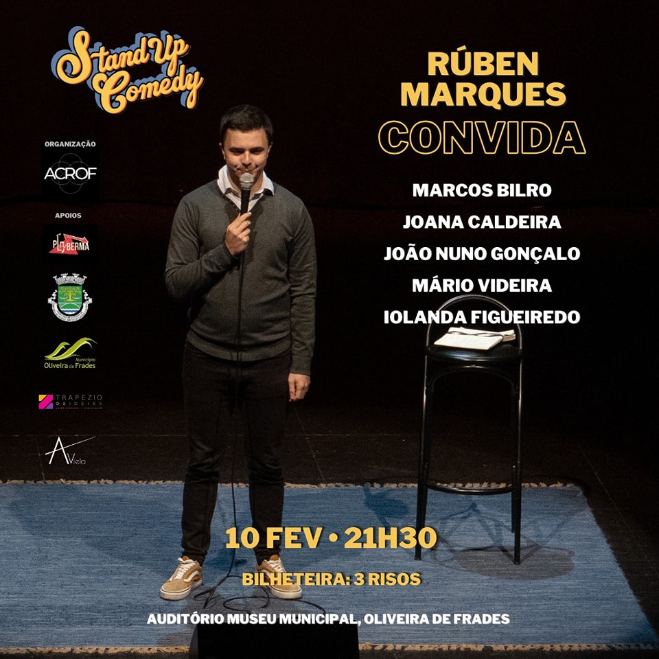 A ACROF - Associação Cultural e Recreativa de Oliveira de Frades, com o apoio de Plaberma Produções, União das Freguesias Oliveira de Frades, Souto de Lafões e Sejães, Municipio de Oliveira de Frades, Trapézio de Ideias e A Viela, faz regressar as sessões de Stand Up Comedy a Oliveira de Frades. No dia 10 de fevereiro de 2024, pelas 21h30, o Auditório do Museu Municipal de Oliveira de Frades, conta com a presença de Rúben Marques, com os convidados Marcos Bilro, Joana Caldeira, João Nuno Gonçalves, Mário Videira e Iolanda Figueiredo.