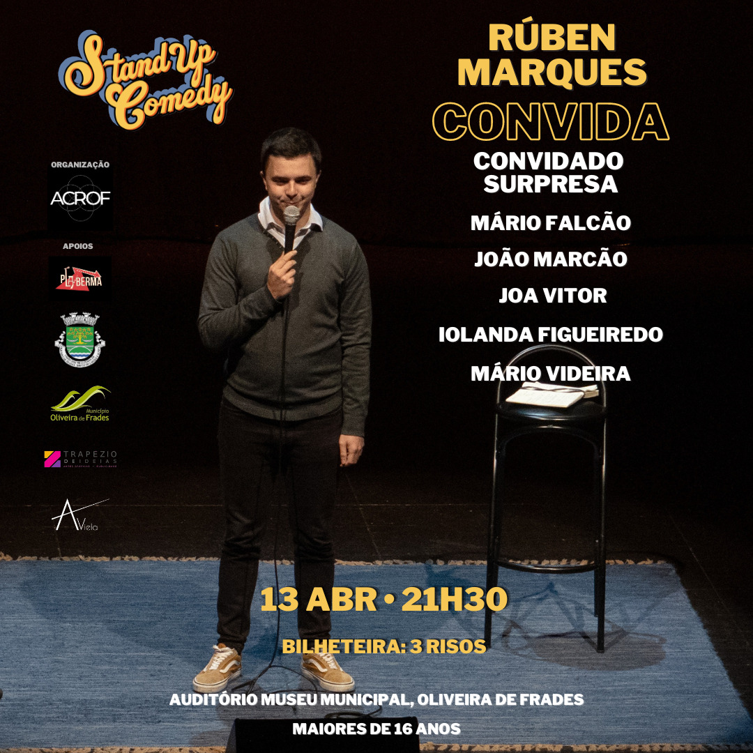 A União das Freguesias de Oliveira de Frades, Souto de Lafões e Sejães, recebe no dia 13 de abril de 2024, às 21h30, o espetáculo de Stand Up Comedy de Rúben Marques, com os convidados: Mário Falcão, João Marcão, Joa Vitor, Iolanda Figueiredo, Mário Videira e um convidado surpresa, que terá lugar no auditório do Museu Municipal de Oliveira de Frades, numa organização da responsabilidade da ACROF - Associação Cultural e Recreativa de Oliveira de Frades.